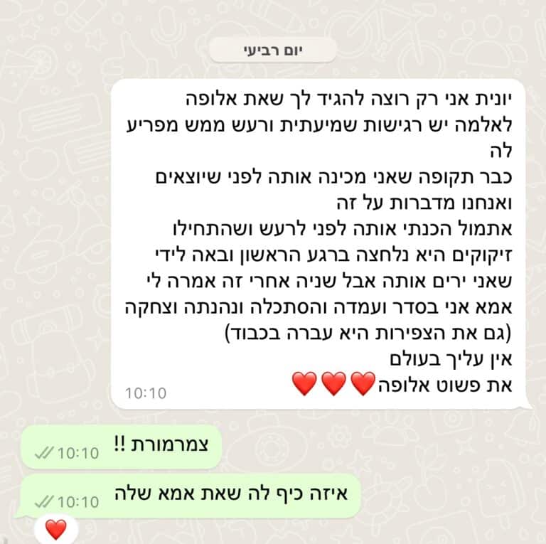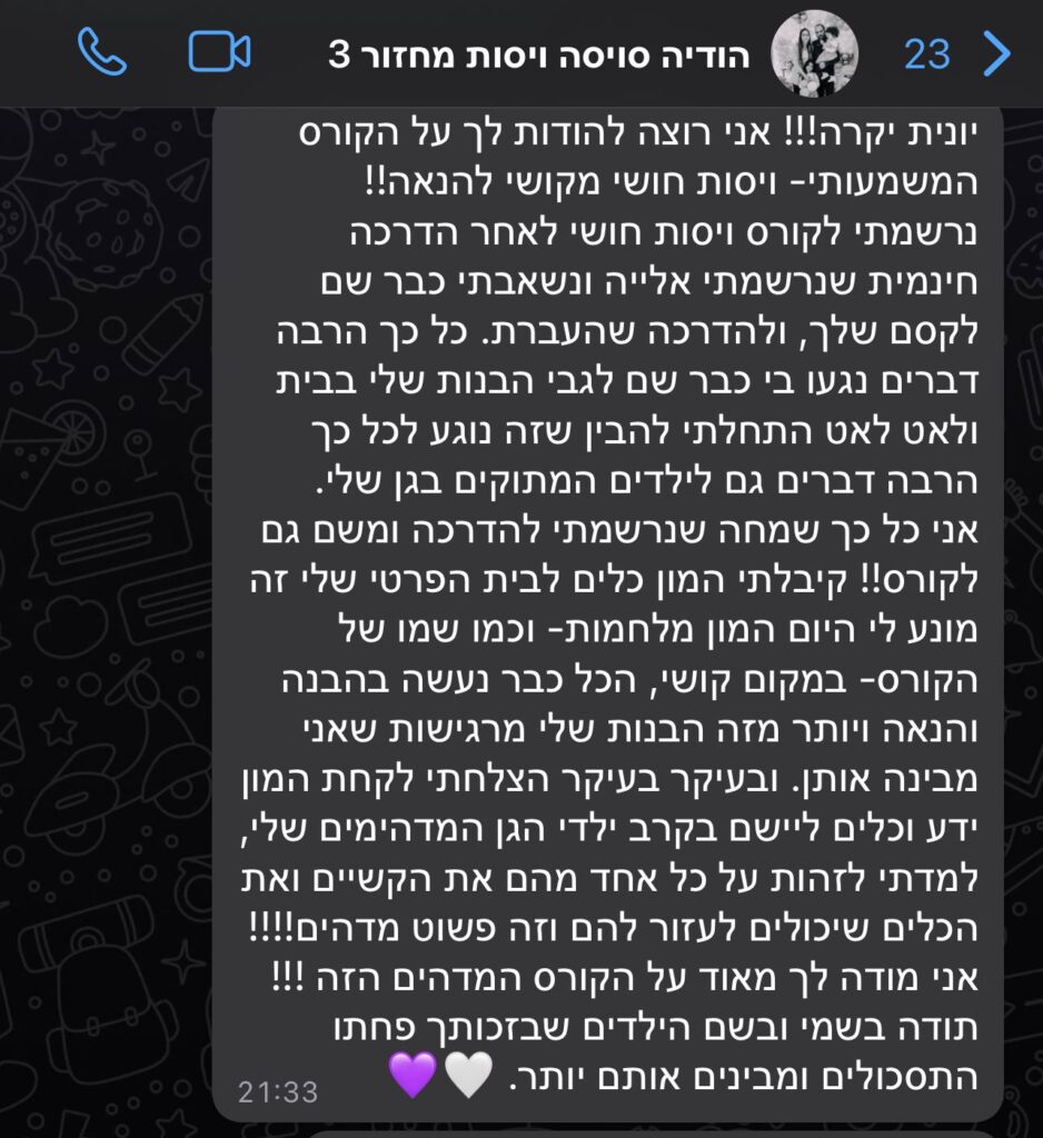 אני זוכרת שהיו לי כל כך הרבה התלבטויות בנוגע לקורס אבל בשנייה שהתחלנו פשוט הוקסמתי. חיכיתי כל שבוע לשיעור החדש, הקשבתי לשיעור המוקלט פעמים נוספות ועם התרגילים שיונית נתנה לנו, דרכי הפתרון לבעיות, ההתמדה ועבודה שלי ושל בעלי בבית בהחלט יכולה לומר שמרגישים את ההבדל. את הקורס לקחתי כדי להבין מה זה בעצם ״ויסות חושי״ ואיך אני מגיעה ועוזרת לילדים שלי בבעיות תחושתיות שלהם, כדי לא לפגוע בקשר בינינו, כדי לעזור להם להצליח להתמודד עם בעיות שנתקלים בדרך לעצמאות, ובעיקר כדי לשמר את השמחה במשפחה שבנינו. הקורס לא רק מעניק ידע הוא גם מעניק פתרונות וכלים מעשיים ופרקטיים לחיים, ומה עושים ׳בתאכלס׳!! בוא נגיד שזה בהחלט לא דיבורים באוויר. בנוסף יכולה להעיד שיונית הייתה מאוד זמינה ועזרה לי להתמודד עם קשיים שעלו במהלך הדרך. ממליצה בחום על הקורס, לא כל בעיה אצל הילד חייבת להפתר עם כדורים ותיוגים. תתכונני להתאהב בתהליך שהתשלום עליו כל כך מעט לעומת כל כך הרבה שמקבלים ושתקבלי בזכותו בית ואמא מאושרים מכילים ומבינים.